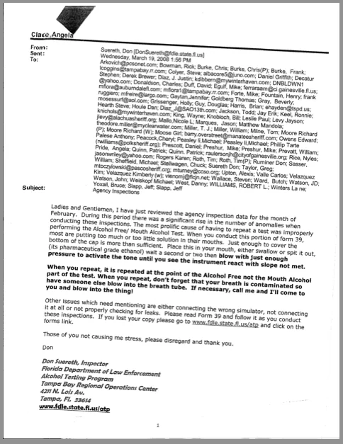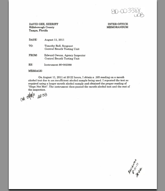 To illustrate this problem, consider an “internal memo” sent last year from the Agency Inspector for the Central Breath Testing Center at the Hillsborough County Sheriff’s Office. The agency inspector is a civilian employed by the Hillsborough County Sheriff’s Office to perform a monthly inspection of the instrument. Part of the test requires the agency inspector to swish a small amount of alcohol in his mouth and then blow in the instrument.