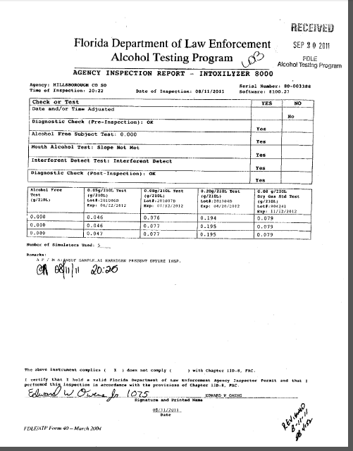 Even the Former Departmental Inspector for FDLE and the current Agency Inspector for the Hillsborough County Sheriff’s Office, Roger Skipper, has seen this problem. Consider a Department Inspection he conducted on 11/08/2011. The instrument alerted him to the fact that the instrument failed the Alcohol Free / Mouth Alcohol Test. The excuse that the used was that AF/ MA: TEST REPEATED DUE TO AF SAMPLE GIVEN FOR MA SAMPLE”